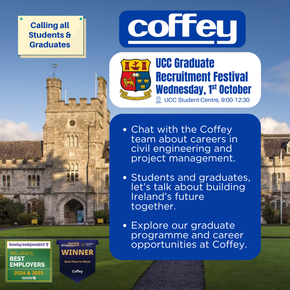 Coffey is excited to be attending the University College Cork Graduate Recruitment Festival on Wednesday, 1st October 2025, at Devere Hall in the UCC Student Centre. This is a fantastic opportunity to meet the next generation of engineers, innovators and change-makers who want to make a real impact across Ireland and the UK.